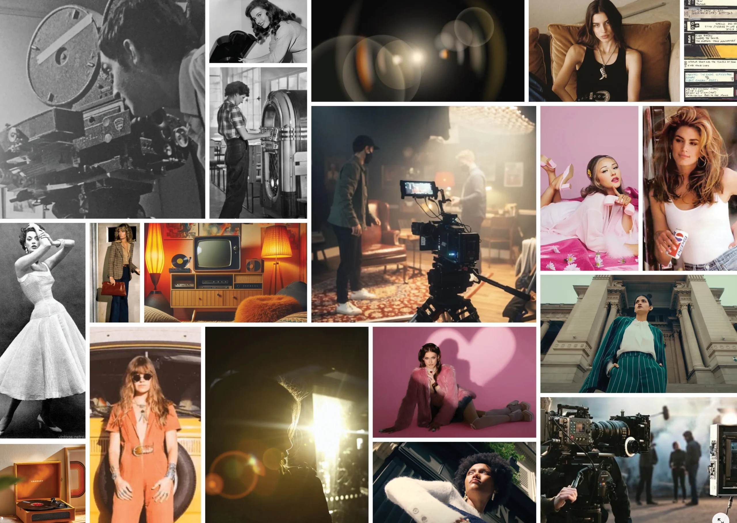 La moodboard raccoglie i riferimenti visivi e stilistici che hanno guidato la costruzione dello spot. Ogni decennio è tradotto attraverso palette cromatiche, texture e atmosfere che evocano il linguaggio dell’epoca: dal bianco e nero elegante degli anni Sessanta ai toni vibranti e sperimentali degli anni Ottanta e Novanta, fino alla precisione nitida e contemporanea della resa digitale. Un percorso che riflette l’evoluzione dell’immagine e prepara il terreno alla potenza visiva della nuova ARRI Alexa 35 Base